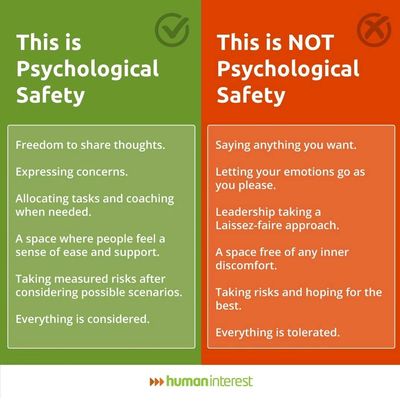Psychological safety refers to a work environment in which employees feel valued, respected, and able to speak up. Where employees feel safe to express themselves and take risks without fear of negative consequences such as humiliation, punishment or discrimination.